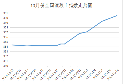 截止11月10日,混凝土价格指数为360.5 , 较10月13日354.35 上涨6.15,较16年同期相比上涨63.75,具体走势如下图: