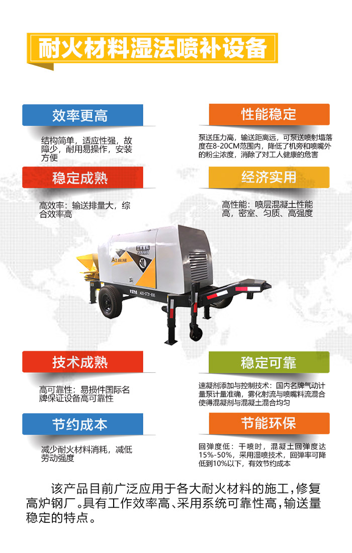 耐火材料湿喷设备适合锚喷支护、高炉喷注、室内外墙喷涂、水泥砂浆灌浆、桥梁灌浆及防水表面喷涂、防火喷涂、保温材料喷涂、天花顶喷涂、墙壁喷涂、涂料喷涂、园林喷涂、浮雕效果涂料喷涂、工艺品喷涂、假山喷涂、吸音材料喷涂、防水堵漏、防水补漏、对于在桥梁、水坝、山坡、地下室、隧道、房屋厂下施工轻巧方便。