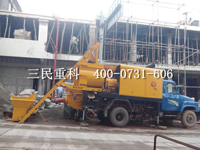 正是因为这些优异的性能,贵州毕节的刘先生才会选择三民重科的搅拌车载泵来完成他承包的建房施工,下图为三民重科使用刘先生自己提供的汽车底盘进行改造的搅拌车载泵施工图。